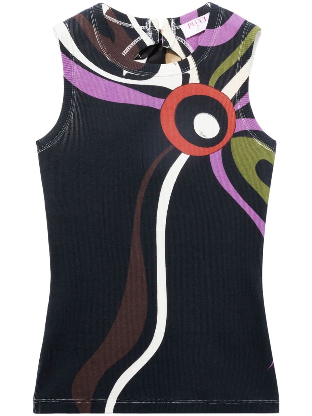 Marmo-print tank top A retro quality characterises PUCCI's aesthetic, owing to the brand's inclination for using modernised archival patterns. A prime example, this black tank top is saturated with the house's wavy Marmo print, a motif which is echoed in the ribbon fastening at the rear. Highlights - Black/multicolour - Stretch-cotton - Abstract pattern print - Cut-out detailing - Contrast stitching - Crew neck - Rear ribbon fastening - Sleeveless - Straight hem Made in Italy Composition Cotton 98%, Elastane 2%