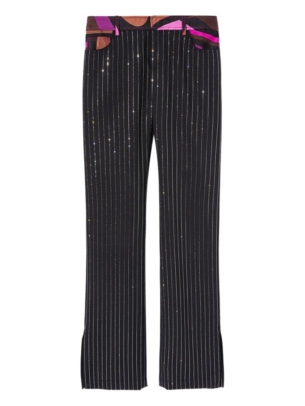 rhinestone-embellished pinstripe trousers Highlights - Black - Pinstripe pattern - Rhinestone embellishment - High waist - Side splits Made in Italy Composition Outer: Virgin Wool 95%, Elastane 5% Lining: Acetate 67%, Polyester 33% Washing instructions Dry Clean Only