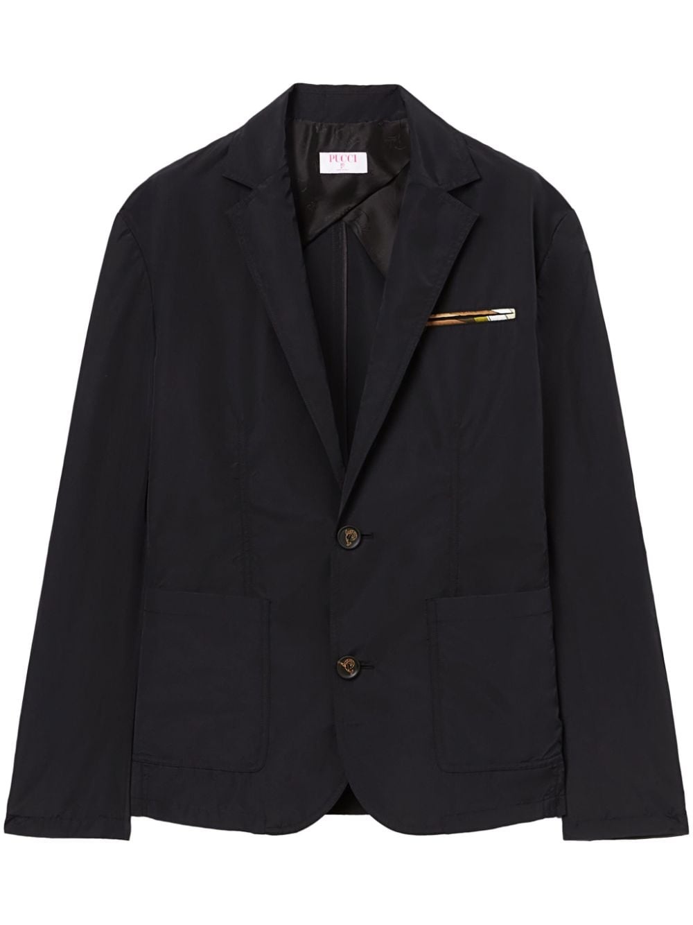 single-breasted tailored blazer Highlights - Black/multicolour - Graphic print at the chest - Narrow notch lapels - Front button fastening - Chest welt pocket - Two front patch pockets - Long sleeves - Buttoned cuffs - Straight hem Made in Italy Composition Nylon 53%, Cotton 47%