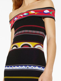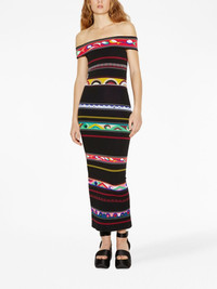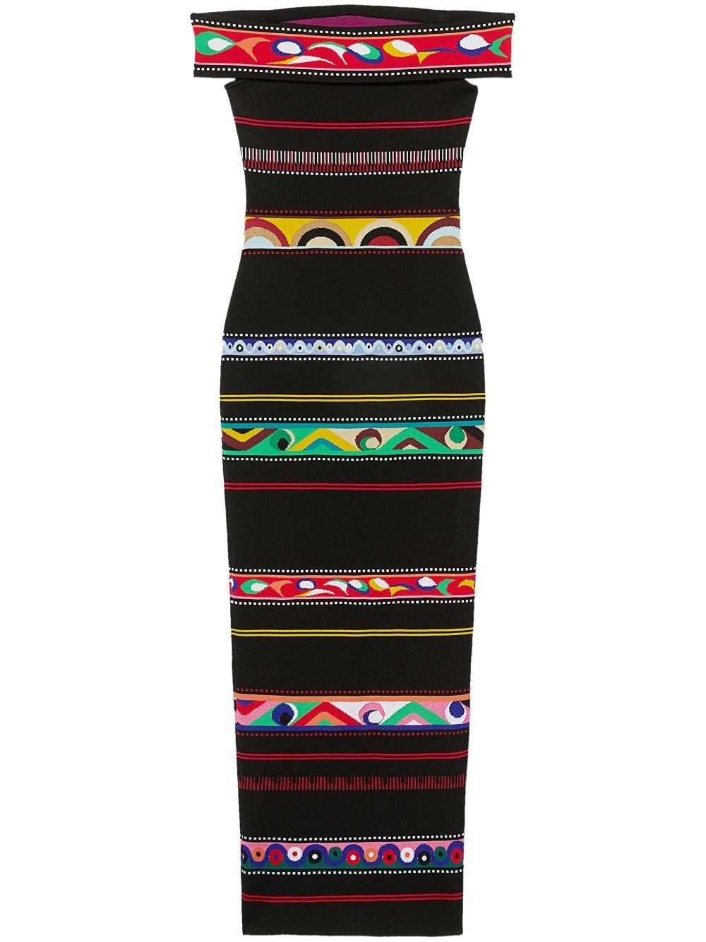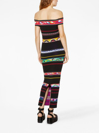 striped open-shoulder dress Highlights - Black/multicolour - Knitted construction - Abstract pattern print - Open-shoulder sleeves - Straight hem - Long length - Rear slit Made in Italy Composition Viscose 81%, Polyester 17%, Polyamide 1%, Elastane 1% SIZE & FIT Measurement HIPS 31.49 in(80 cm) LENGTH 45.66 in(116 cm) WAIST 25.98 in(66 cm) BUST 25.98 in(66 cm)