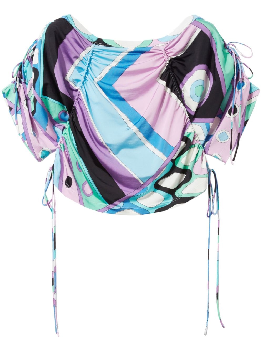 Vivara-print cropped blouse Highlights - Sky blue/multicolour - Stretch-design - All-over vivara print - Gathered detailing - Round neck - Side drawstring fastening - Short sleeves - Cropped Made in Italy Composition Viscose 95%, Elastane 5%