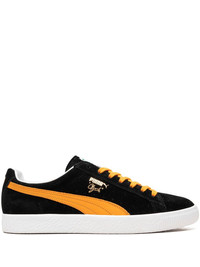 ClydeZilla MIJ "Clyde Low" sneakers PUMA's Clyde sneaker is a signature style for the label. This iteration is crafted from black suede and is decorated with a yellow Formstrip on the sides. The low-top pair sits atop a flat rubber sole, providing comfort and traction. Highlights - Black/yellow - Calf suede - Logo print to the side - Round toe - Side stripe detailing - Front lace-up fastening - Embossed logo to the rear - Flat rubber sole Imported Composition Suede 100%