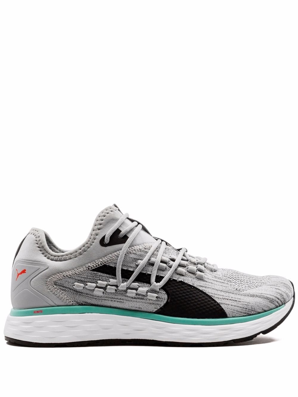 Speed 600 Fusefit sneakers Puma's latest Speed 600 design was created to offer a responsive and energetic approach towards long-distance travels. Placed atop the brand's proprietary foams, the low-top pair are a lightweight and comfortable pick for longer strides. Highlights - High rise grey/turquoise blue - Knitted upper - Sock-style ankle - Branded insole - Flat rubber sole - Front lace-up fastening - Logo patch at the tongue - These styles are supplied by a premium sneaker marketplace. stocking only the most sought-after footwear, they source and curate some of the most hard to find sneakers from around the world. Imported Composition Lining: Nylon 100% Outer: Polyester 100% Sole: Rubber 100%