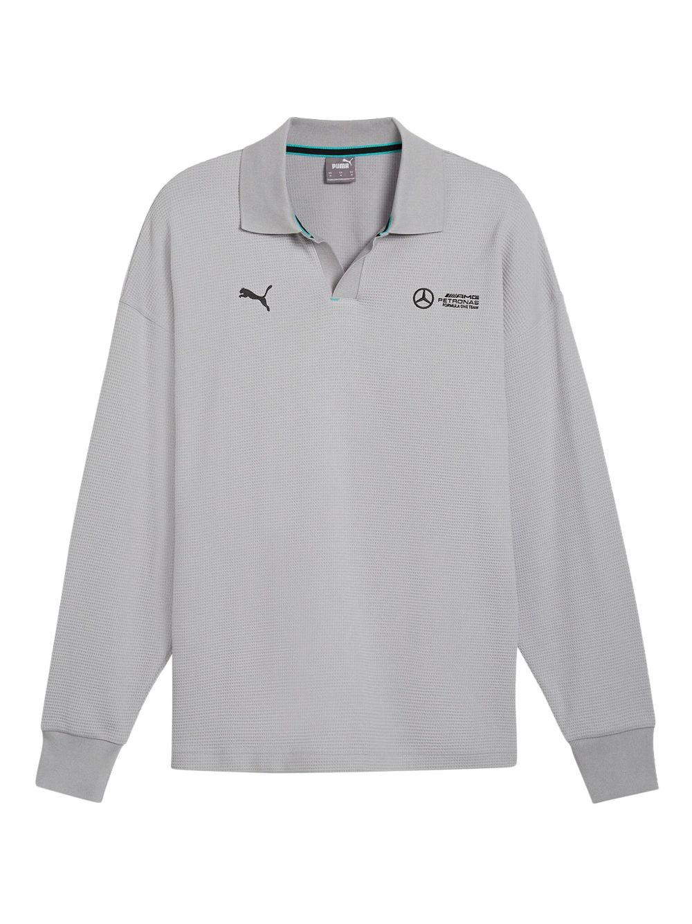 x Mercedes AMG Petronas F1 Team logo-embroidered polo shirt Highlights - Grey - Long sleeves - Polo collar - Ribbed cuffs - Logo embroidery Imported Composition Cotton 77%, Recycled Polyester 23% Washing instructions Read Manufacturer Guidelines