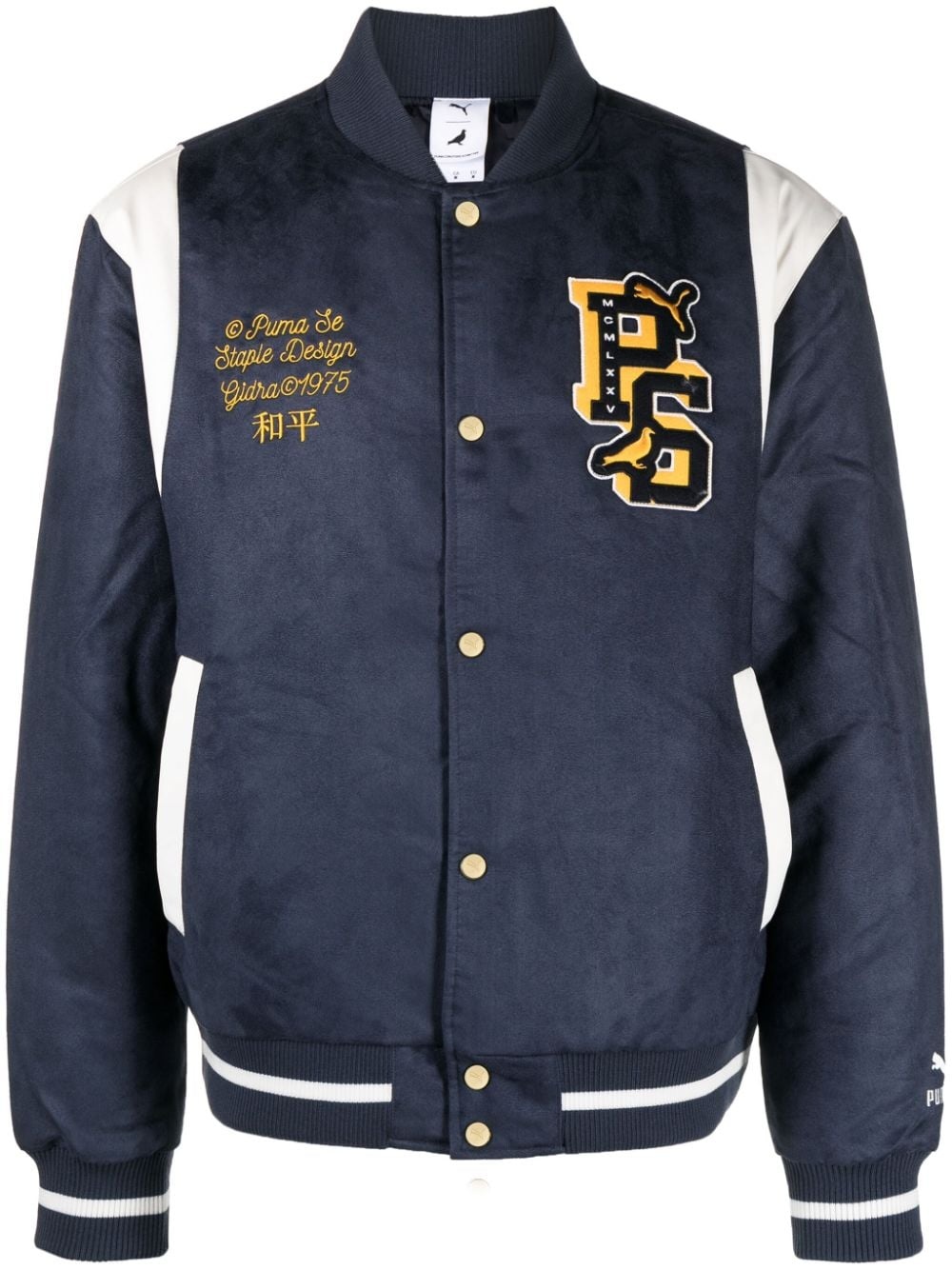 x Staple logo-patch varsity jacket Highlights - New navy blue - Panelled design - Padded design - Embroidered slogan at the chest - Logo patch at the chest - Embroidered logo at the sleeve - Embossed gold-tone buttons - Ribbed band collar - Front press-stud fastening - Long sleeves - Ribbed cuffs and hem - Two side welt pockets - Straight hem - Satin lining Imported Composition Outer: Polyester 100% Lining: Polyester 100% SIZE & FIT Model measurements Height 6 ft 2 in(1.87 m) Bust/Chest 38.18 in(97 cm) Hips 36.61 in(93 cm) Waist 29.13 in(74 cm) FittingInformation Designed for a relaxed fit, this piece allows for comfort and movement when worn The ribbed hem offers a close, comfortable fit Made from a midweight non-stretch fabric This piece fits true to size – take your usual size Washing instructions Dry Clean Only