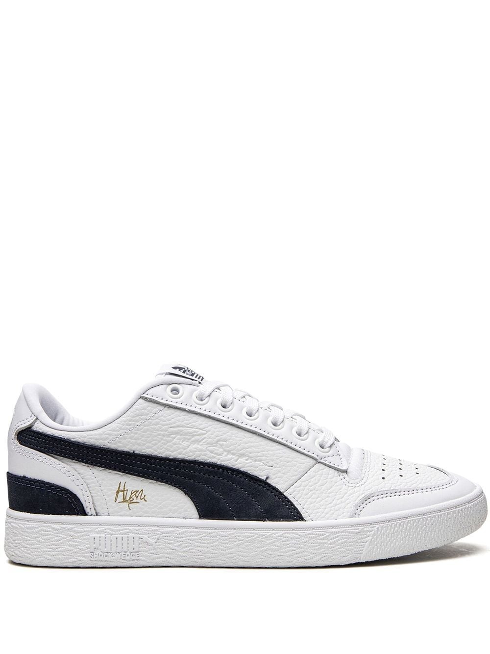 x TMC Ralph Sampson "Hussle Way" sneakers Designed in collaboration with The Marathon Clothing (TMC) these PUMA Ralph Sampson sneakers feature a white premium leather upper decorated with distinctive details - such as the woven PUMA x TMC label on the tongue and Nipsey Hussle’s signature in Gold foil at the lateral side. The iconic Puma formstrip on the side, in a navy blue hue, and the Puma cat logo on the heels complete the look. Imported Composition Leather 100%