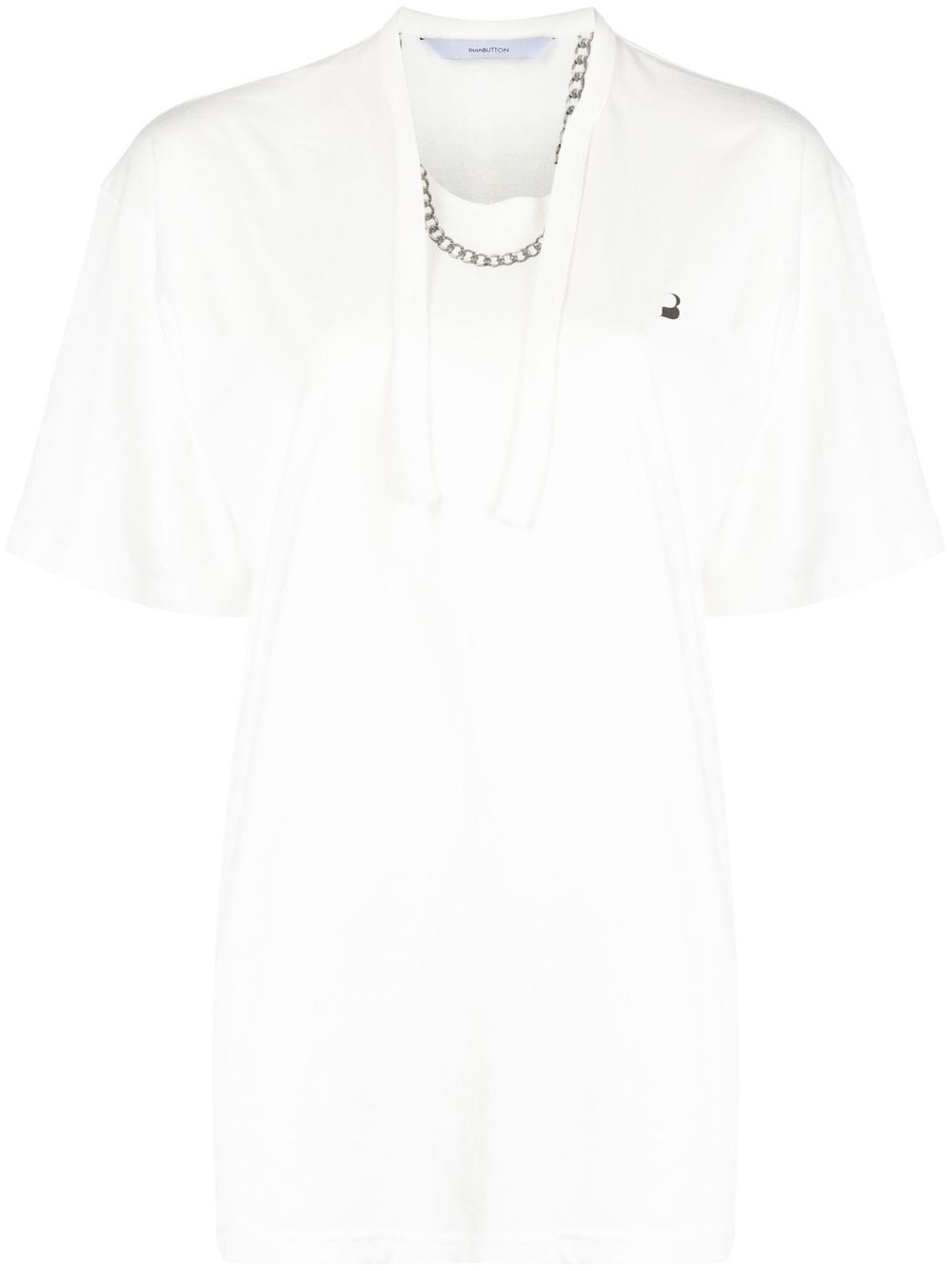 necklace-print oversized T-shirt off-white cotton logo print at the chest graphic print at the chest strap detailing round neck short sleeves straight hem Imported Composition Body: Cotton 100% SIZE & FIT Model measurements Height 5 ft 11 in(1.8 m) Bust/Chest 28.34 in(72 cm) Hips 35.43 in(90 cm) Waist 23.62 in(60 cm) FittingInformation This piece fits true to size. We recommend you get your regular size Cut for a relaxed fit Made with a mid-weight fabric Washing instructions Hand Wash