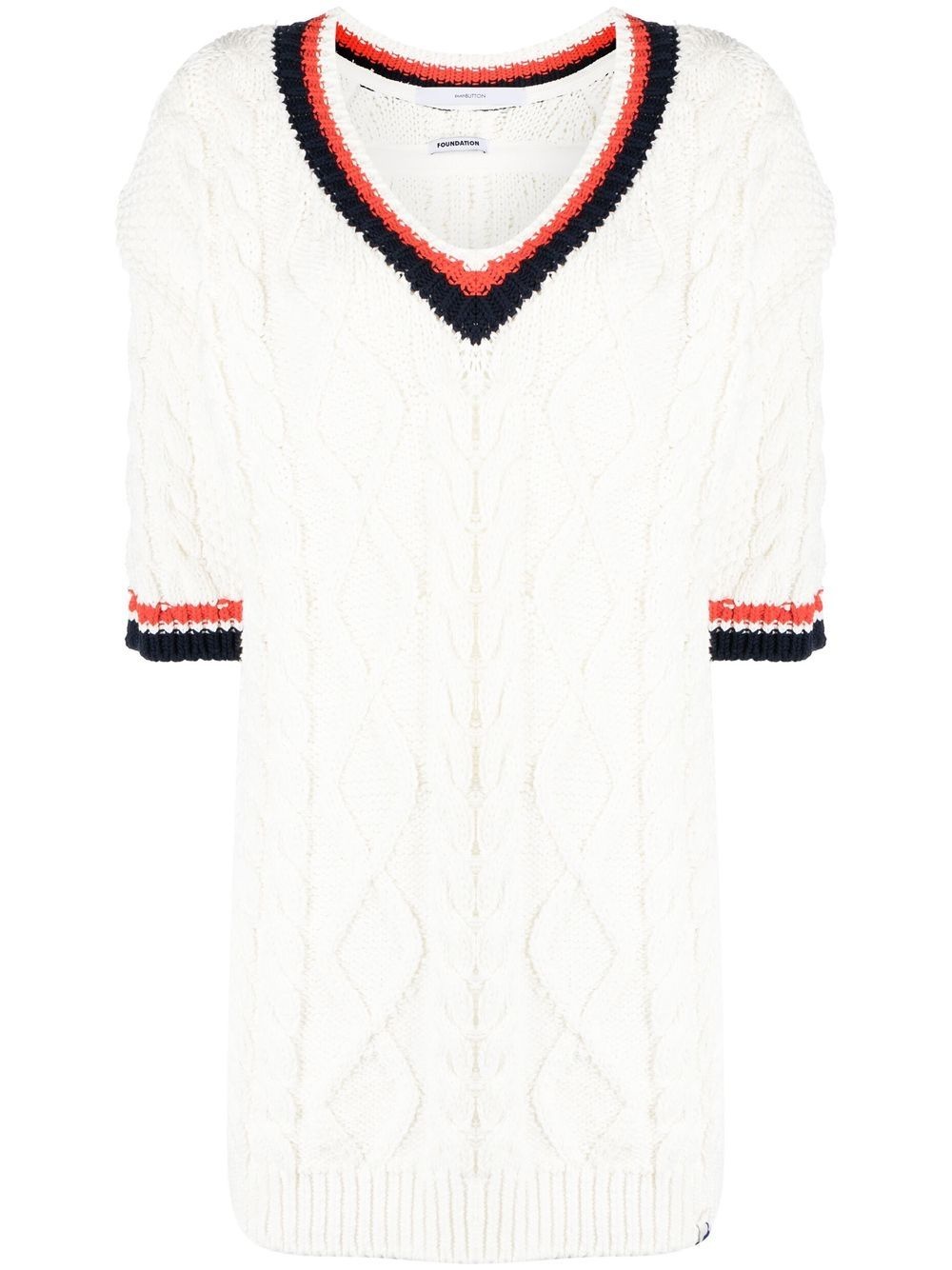 three-quarter sleeve cable-knit top off-white cotton blend cable knit V-neck three-quarter length sleeves striped border ribbed hem Imported Composition Body: Cotton 78%, Polyester 22% SIZE & FIT Model measurements Height 5 ft 11 in(1.8 m) Bust/Chest 28.34 in(72 cm) Hips 35.43 in(90 cm) Waist 23.62 in(60 cm) FittingInformation This piece fits true to size. We recommend you get your regular size Cut for a loose fit Made with a mid-weight fabric Washing instructions Dry Clean Only