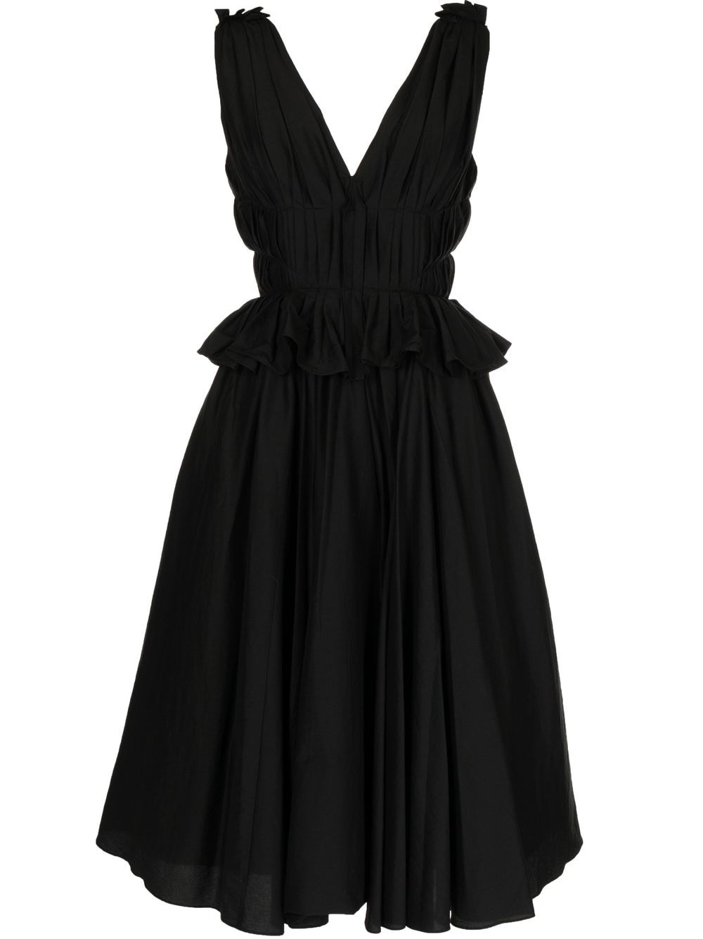 v-neck midi dress black plunging V-neck sleeveless ruched detailing layered details Imported Composition Body: Linen/Flax 36%, Nylon 35%, Cotton 29% SIZE & FIT Model measurements Height 5 ft 11 in(1.8 m) Bust/Chest 28.34 in(72 cm) Hips 35.43 in(90 cm) Waist 23.62 in(60 cm) FittingInformation This piece fits true to size. We recommend you get your regular size Designed for a close fit at the bust and waist, but loose at the hip Made with a mid-weight non-stretch fabric Washing instructions Dry Clean Only