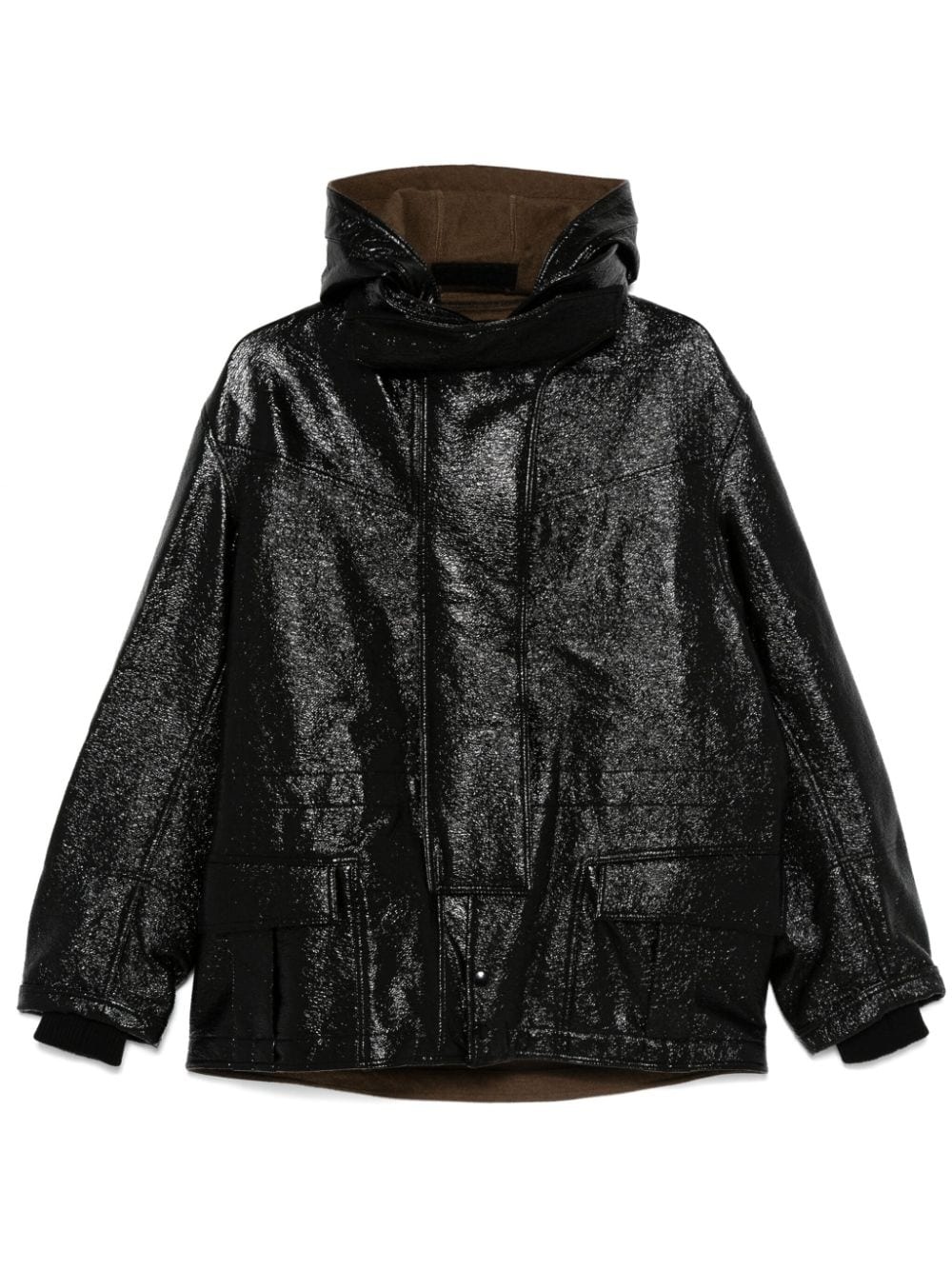 coated-finish coat Highlights - Black - Virgin wool - Grained texture - Coated finish - Concealed zip and touch-strap fastening - High-shine finish - Stand-up collar - Classic hood - Long sleeves - Two side flap pockets - Straight hem Made in United States Composition Virgin Wool 100% Washing instructions Dry Clean Only