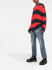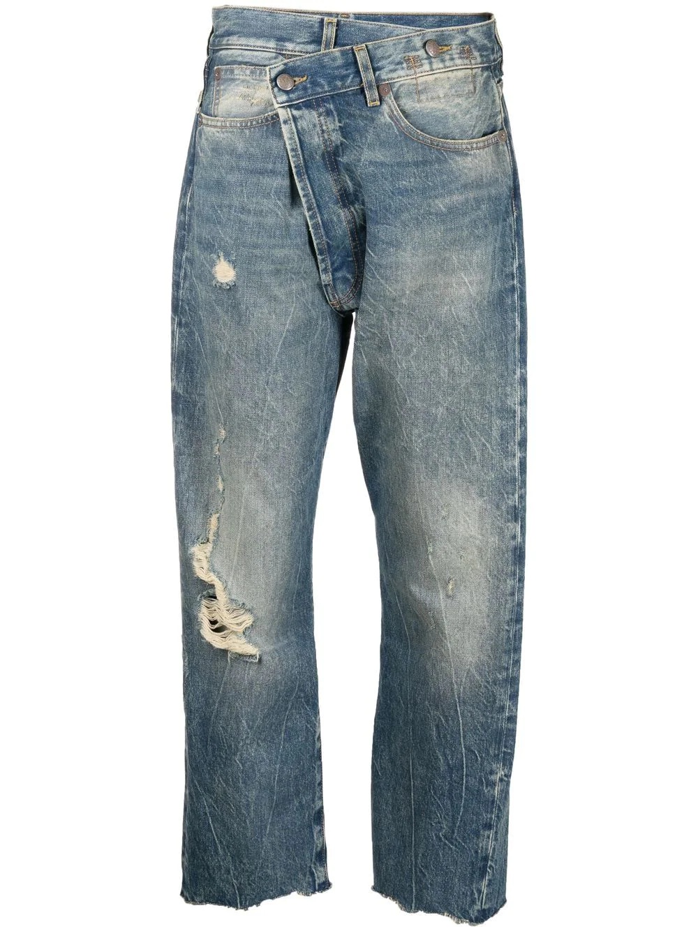 cropped distressed jeans R13's punk-inspired aesthetic is showcased with these distressed jeans. Defined by rips to the front and a raw-cut hem, the design is crafted in blue-hued washed denim. Made in Italy Composition Cotton 100% SIZE & FIT Model measurements Height 5 ft 10 in(1.78 m) Bust/Chest 31.49 in(80 cm) Hips 37 in(94 cm) Waist 23.62 in(60 cm) FittingInformation This piece fits true to size. We recommend you get your regular size Designed to be fitted at the waist and hips, loose over the leg Made with a mid-weight non-stretch fabric Washing instructions Machine Wash