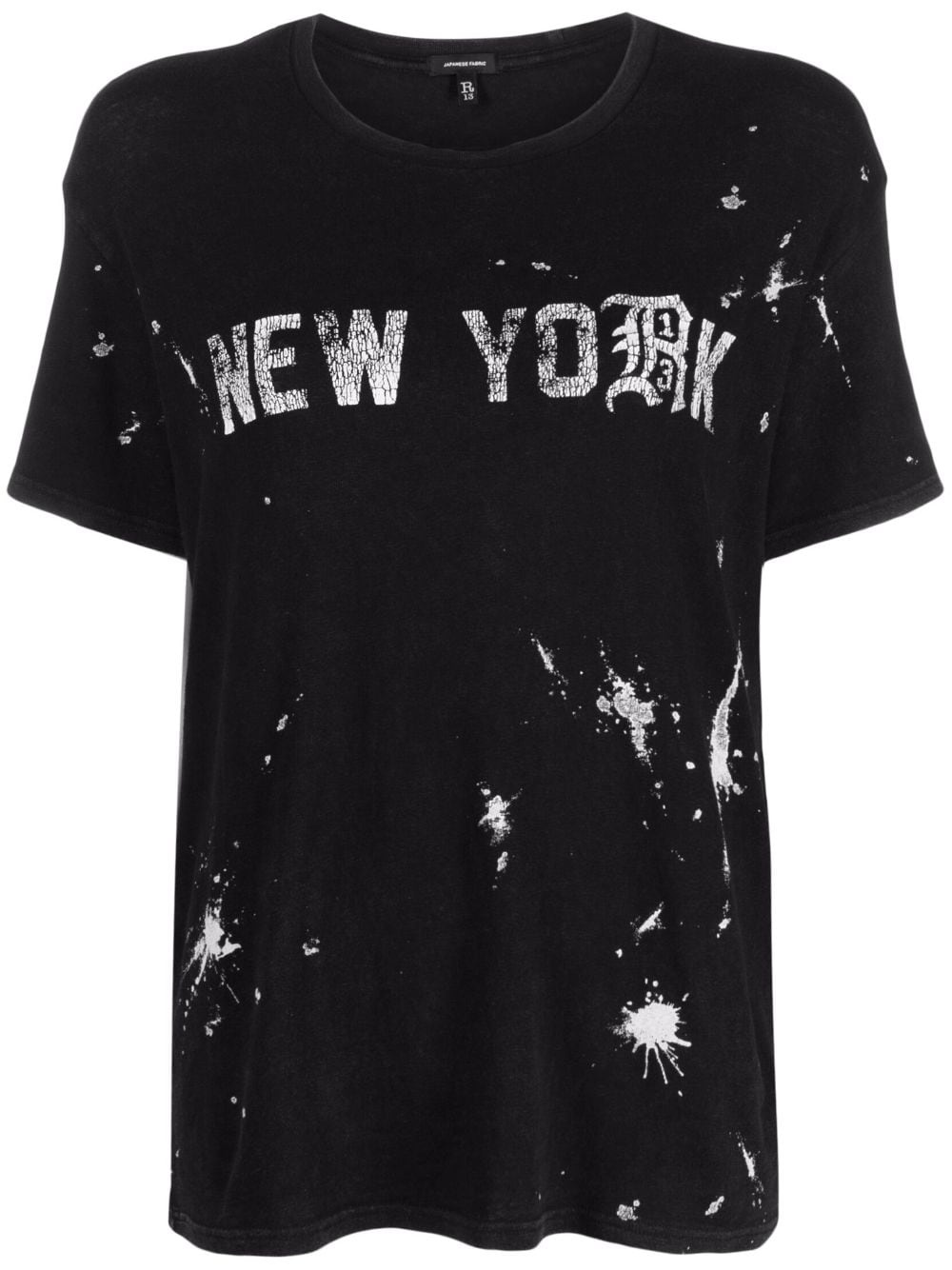 paint-splatter T-shirt R13's street-style inspired aesthetic is finely demonstrated by this T-shirt. Splattered with paint throughout, the signature logo is blended with the 'New York' print. Highlights - Black - Stretch-cotton - Paint splatter detail - Logo print to the front - Slogan print to the front - Crew neck - Short sleeves Imported Composition Cotton 97%, Spandex/Elastane 3% SIZE & FIT Model measurements Height 5 ft 10 in(1.78 m) Bust/Chest 30.7 in(78 cm) Hips 34.64 in(88 cm) Waist 23.22 in(59 cm) Measurement SLEEVE LENGTH 7.48 in(19 cm) Shoulder Width 18.5 in(47 cm) LENGTH 25.98 in(66 cm) BUST 42.51 in(108 cm) FittingInformation Designed to be unstructured, offering a loose fit throughout Made from a lightweight stretch fabric, this piece offers elasticity and flexibility when worn This piece fits true to size – take your usual size