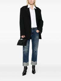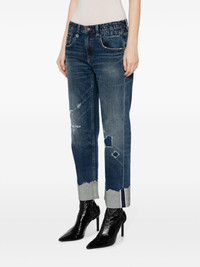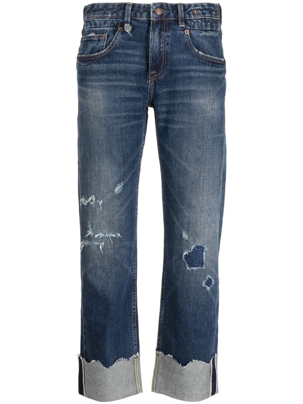 ripped-detail straight-leg jeans Cut from blue denim, these straight-leg jeans by R13 are characterised by ripped detailing and a raw turn-up hem that speaks to the label's rebellious side. Highlights - Blue - Denim - Ripped detailing - Belt loops - Concealed fly and button fastening - Classic five pockets - Logo patch to the rear - Straight leg - Turn-up hem - Raw edge Imported Composition Trims: Horse Leather 100% Outer: Cotton 96%, Polyurethane 4% SIZE & FIT Model measurements Height 5 ft 9 in(1.76 m) Bust/Chest 31.1 in(79 cm) Hips 35.03 in(89 cm) Waist 24.4 in(62 cm) FittingInformation Designed for a straight-leg fit, these jeans allow for a close fit at the waist and an unrestricted and comfortable fit over the leg Cropped in length Constructed from stretch denim, this piece offers a stretch fit with durability This piece fits true to size – take your usual size Measurement BACK RISE 13.18 in(33.5 cm) FRONT RISE 9.44 in(24 cm) Hem Width 7.67 in(19.5 cm) HIPS 37 in(94 cm) INSIDE LEG 33.07 in(84 cm) WAIST 30.7 in(78 cm) Washing instructions Machine Wash
