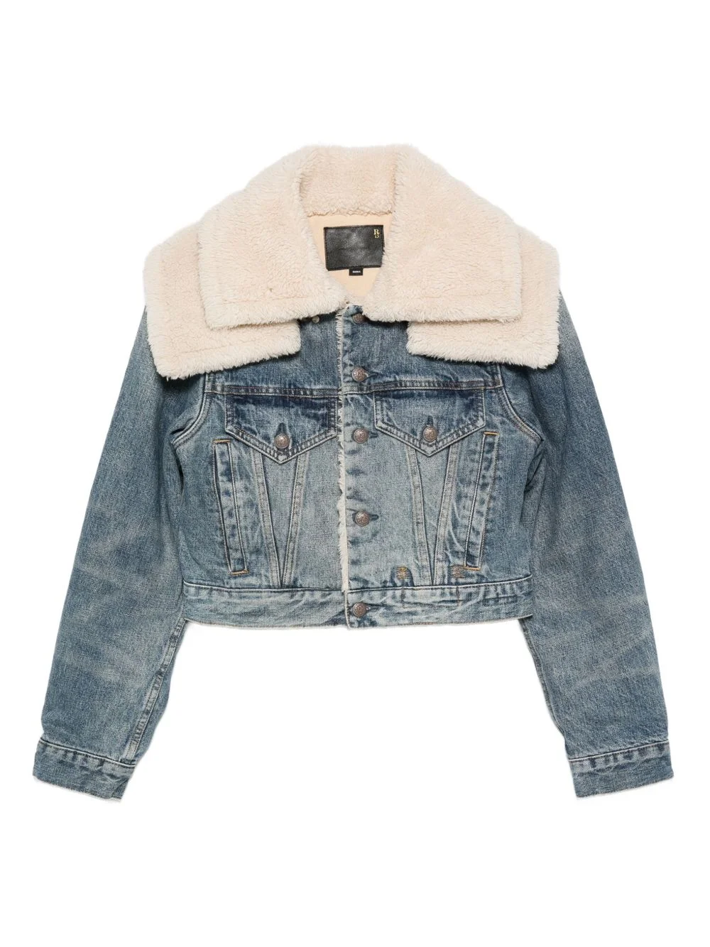 sherpa-collar denim jacket Highlights - Light blue - Denim - Shearling collar - Cropped - Button fastening - Classic five-pocket design Imported Composition Outer: Polyester 100%, Cotton 100%, Calf Leather 100% Lining: Cotton 100% SIZE & FIT Model measurements Height 5 ft 11 in(1.8 m) Bust/Chest 31.49 in(80 cm) Hips 36.61 in(93 cm) Waist 24.4 in(62 cm) Measurement LENGTH 17.71 in(45 cm) WAIST 31.49 in(80 cm) BUST 35.43 in(90 cm) Shoulder Width 16.92 in(43 cm) Washing instructions Machine Wash
