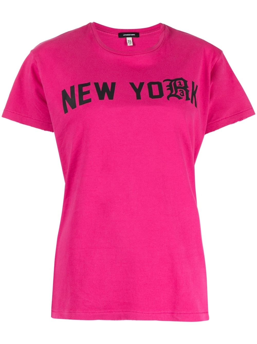 text-print cotton T-shirt Crafted from cotton in a bold pink hue, this T-shirt from R13 is adorned with a New York text print at the front for a statement look. Highlights - Hot pink - Cotton - Text print - Round neck - Short sleeves - Straight hem Made in Italy Composition Body: Cotton 100% SIZE & FIT Model measurements Height 5 ft 10 in(1.78 m) Bust/Chest 30.31 in(77 cm) Hips 34.64 in(88 cm) Waist 24.01 in(61 cm) Measurement SLEEVE LENGTH 5.98 in(15.2 cm) LENGTH 25 in(63.5 cm) WAIST 39.01 in(99.1 cm) BUST 40 in(101.6 cm) FittingInformation Designed for a relaxed fit, this piece allows for comfort and movement when worn Made from a midweight non-stretch fabric, this piece offers minimal elasticity when worn This piece fits true to size – take your usual size Washing instructions Machine Wash