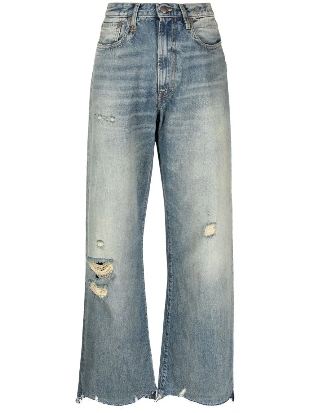 Wayne wide-leg jeans Punctuated with ripped details that complement their distressed finish, the Wayne jeans reflect R13's contemporary take on denim. Sitting high at the waist, the pair falls to a slouchy wide leg. Highlights - Blue - Cotton - Distressed finish - High-waisted - Concealed fly and button fastening - Belt loops - Classic five pockets - Logo patch to the rear - Ripped detailing - Wide leg Made in Italy Composition Cotton 100%, Calf Leather 100% Washing instructions Machine Wash