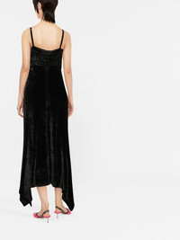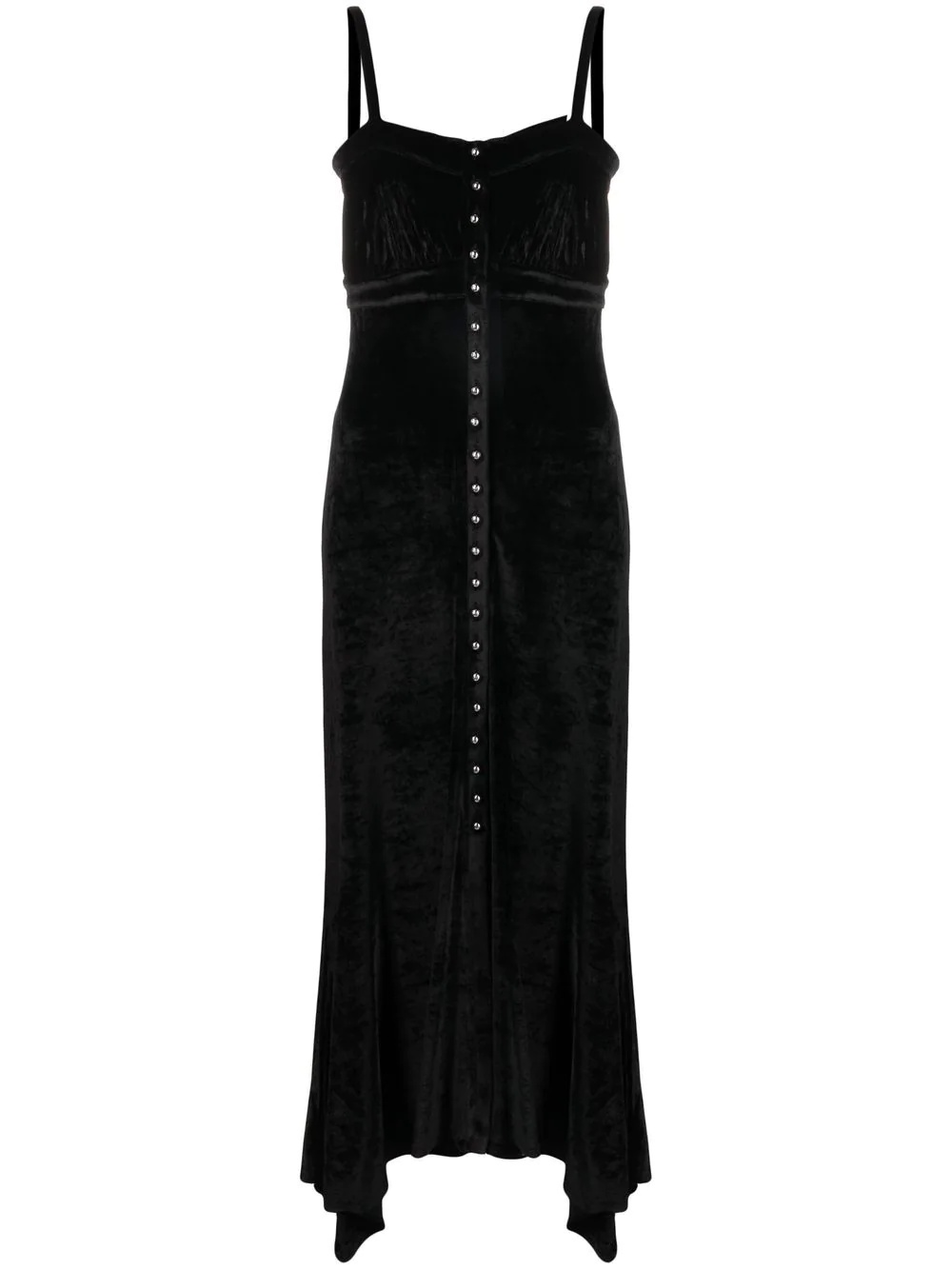 asymmetric button-up midi dress Renowned for their use of lustrous textures, this midi dress from Paco Rabanne flaunts an all-over velvet effect. The luxe construction is decorated with silver-tone rounded buttons that stand out at the centre of its design, thanks to the black backdrop. Imported Composition Viscose 70%, Polyamide 25%, Spandex/Elastane 5% SIZE & FIT Model measurements Height 5 ft 11 in(1.8 m) Bust/Chest 31.49 in(80 cm) Hips 35.43 in(90 cm) Waist 25.19 in(64 cm) FittingInformation This piece fits true to size. We recommend you get your regular size Designed for a close fit at the bust, waist and hips Made with a mid-weight stretch fabric Washing instructions Dry Clean Only