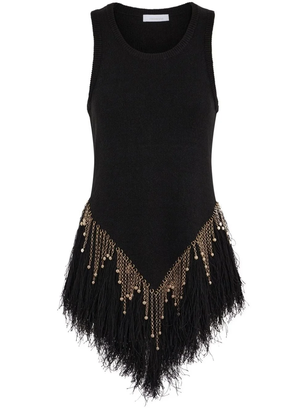 beaded linen top This black tank top is a testament to Rabanne's signature house codes. It's elevated by beaded fringes and feathers, both recurring embellishments used by the Spanish brand. Highlights - Black - Linen - Fine ribbed - Bead embellishment - Feather detailing - Scoop neck - Wide shoulder straps - Sleeveless - Handkerchief hem Imported Composition Linen/Flax 100% Washing instructions Read Manufacturer Guidelines