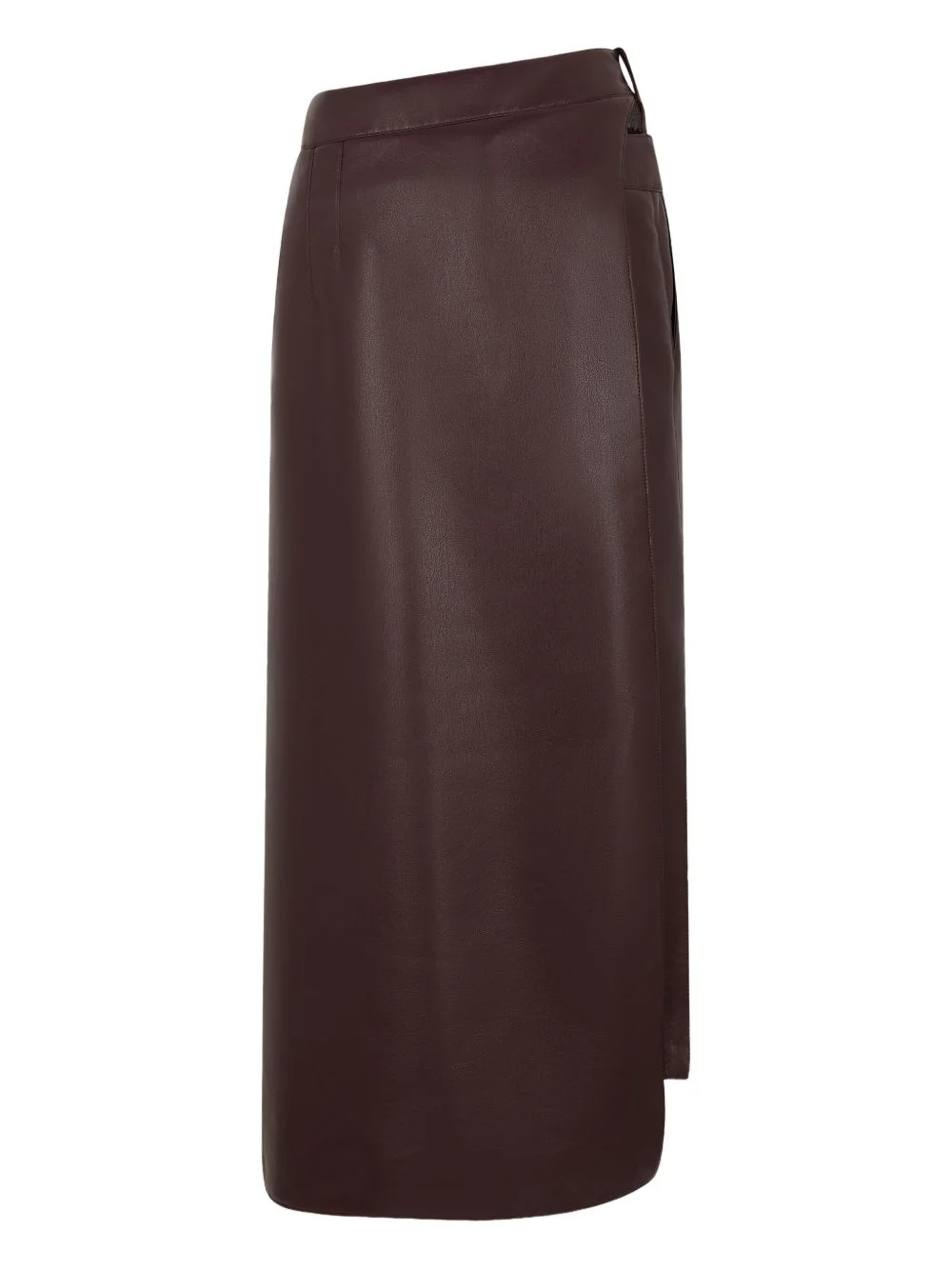 belted leather split midi skirt Highlights - Dark brown - Faux leather - Asymmetrical hem - Side split - Belted waist - Wrap-around effect Made in France Composition Polyurethane 51%, Polyester 49% Washing instructions Read Manufacturer Guidelines