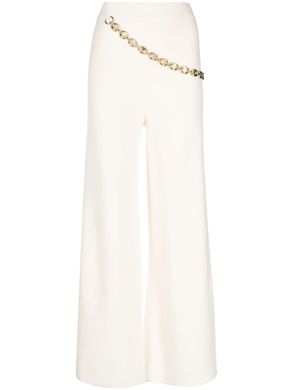 chainmail-detail wool-cashmere trousers Highlights - Ecru - Wool-cashmere blend - Knitted construction - Gold-tone hardware - Chainmail effect - Wide leg Imported Composition Merino 58%, Cashmere 25%, Polyamide 13%, Elastane 4% SIZE & FIT Model measurements Height 5 ft 11 in(1.8 m) Bust/Chest 33.07 in(84 cm) Hips 37.4 in(95 cm) Waist 25.19 in(64 cm) FittingInformation Designed with a wide-leg cut, these trousers allow for a close fit at the waist and offer a loose and roomy fit over the leg The elasticated waist allows for a comfortable fit Made with a midweight knit, this piece offers some stretch This piece fits true to size – take your usual size Washing instructions Hand Wash