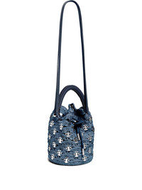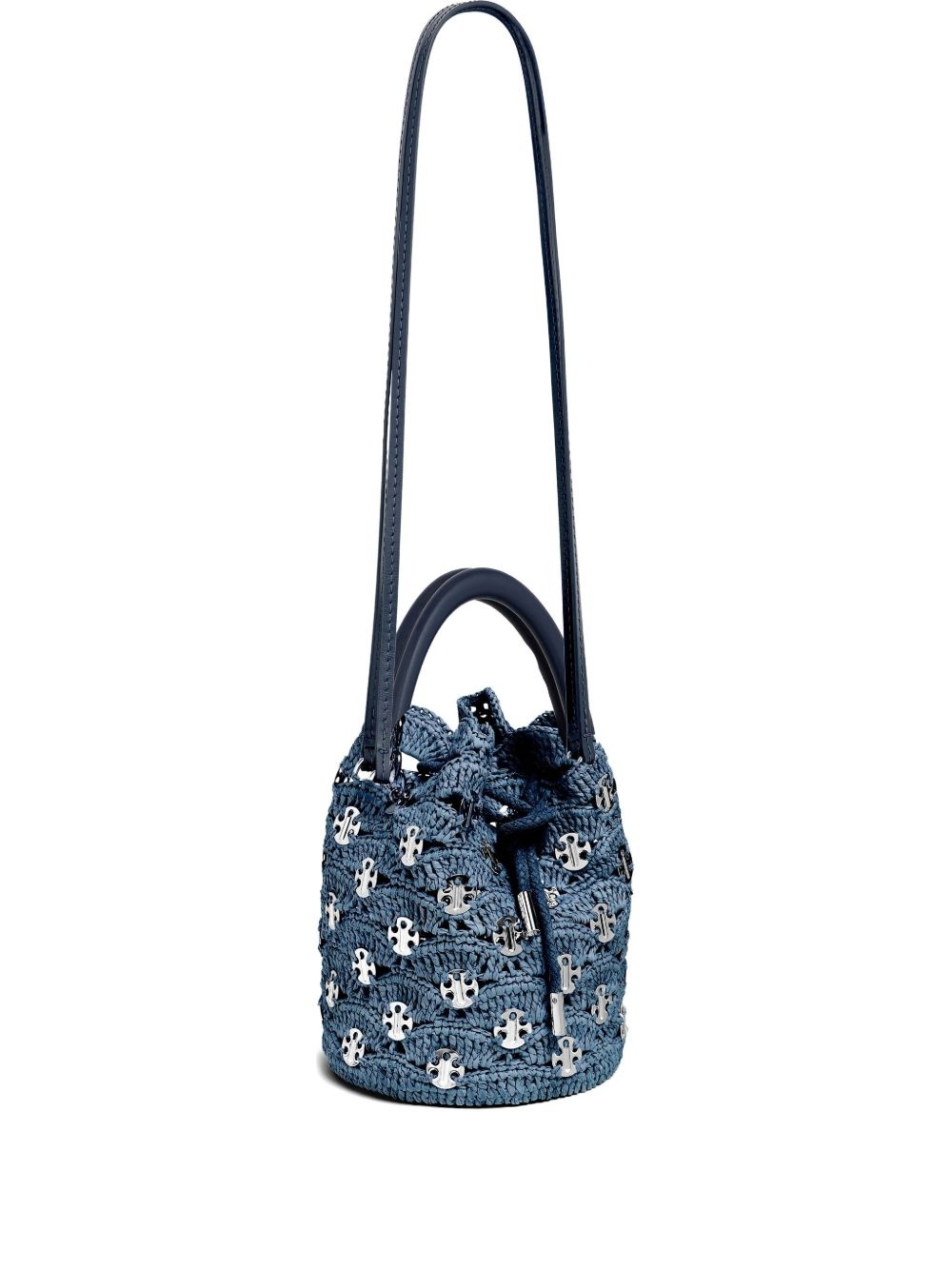 crochet bucket bag Highlights - Denim blue - Decorative logo detailing - Drawstring closure - Dual top handles - Lined interior Imported Composition Outer: Raffia 100%, Calf Leather 100%