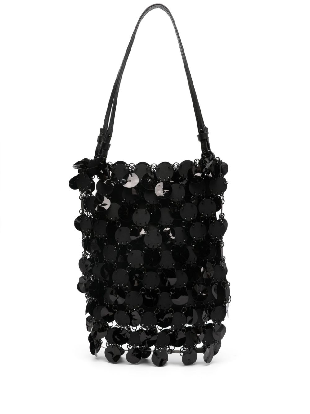 disc-embellished tote bag Highlights - Black - Disc embellishment - Articulated links - Two adjustable top handles - Logo charm - Main compartment - Internal logo plaque - Full lining - Gunmetal-tone hardware - Concealed magnetic fastening - This piece comes complete with a protective dust bag. Made in France Composition Outer: Polyester 80%, Metal 15%, Calf Leather 5% SIZE & FIT Model measurements Height 5 ft 10 in(1.78 m) Bust/Chest 33.07 in(84 cm) Hips 36.61 in(93 cm) Waist 24.8 in(63 cm) Measurement HEIGHT 10.23 in(26 cm) STRAP 22.83 in(58 cm) WIDTH 12.2 in(31 cm)