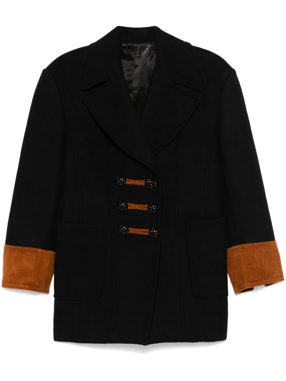 double-breasted coat Highlights - Black/camel brown - Virgin wool blend/cotton - Corduroy detailing - Colour-block panelled design - Double-breasted button fastening - Notched lapels - Shoulder pads - Long sleeves - Split cuffs - Two front patch pockets - Martingale to the rear - Full lining - Internal slip pocket - Straight hem Imported Composition Outer: Cotton 100%, Virgin Wool 75%, Polyamide 25% Lining: Viscose 52%, Cupro 48%