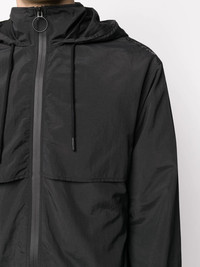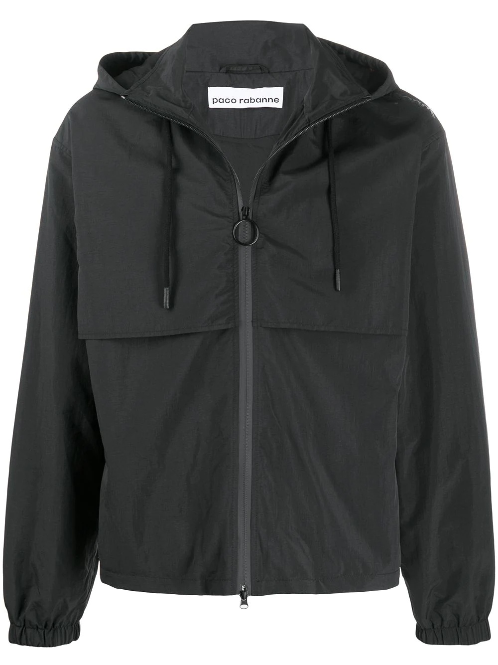 drawstring hooded jacket Black drawstring hooded jacket from Paco Rabanne featuring a drawstring hood, a front zip fastening, long sleeves and fitted cuffs. Please note this item is unisex and sold in men's sizing. Imported Composition Nylon 100% SIZE & FIT Model measurements Height 5 ft 9 in(1.76 m) Bust/Chest 29.92 in(76 cm) Hips 33.46 in(85 cm) Waist 24.01 in(61 cm) Measurement CHEST 42.51 in(108 cm) SLEEVE LENGTH 22.83 in(58 cm) Shoulder Width 19.68 in(50 cm) FittingInformation This piece is unisex. Please take care when selecting your size Designed for a loose fit for men and an oversized fit for women Made with a mid-weight non-stretch fabric Washing instructions Hand Wash