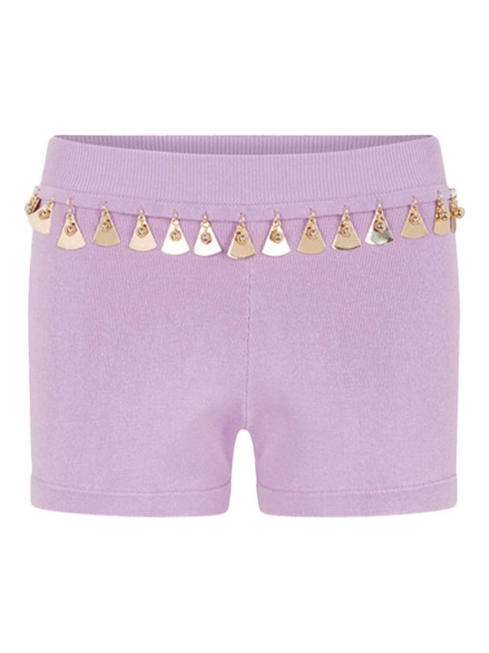 embellished knit shorts Highlights - Light purple - Gold-tone embellishment - High waist - Ribbed knit - Elasticated waistband Imported Composition Silk 44%, Cotton 36%, Elastane 20% Washing instructions Read Manufacturer Guidelines