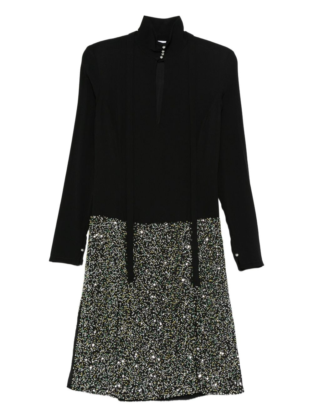 embellished self-tie dress Highlights - Black - Embellished skirt - High neck - Long sleeves - Front tie detail Imported Composition Fabric 100% SIZE & FIT Model measurements Height 5 ft 10 in(1.77 m) Bust/Chest 32.28 in(82 cm) Hips 35.03 in(89 cm) Waist 25.19 in(64 cm) Washing instructions Read Manufacturer Guidelines
