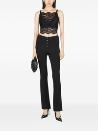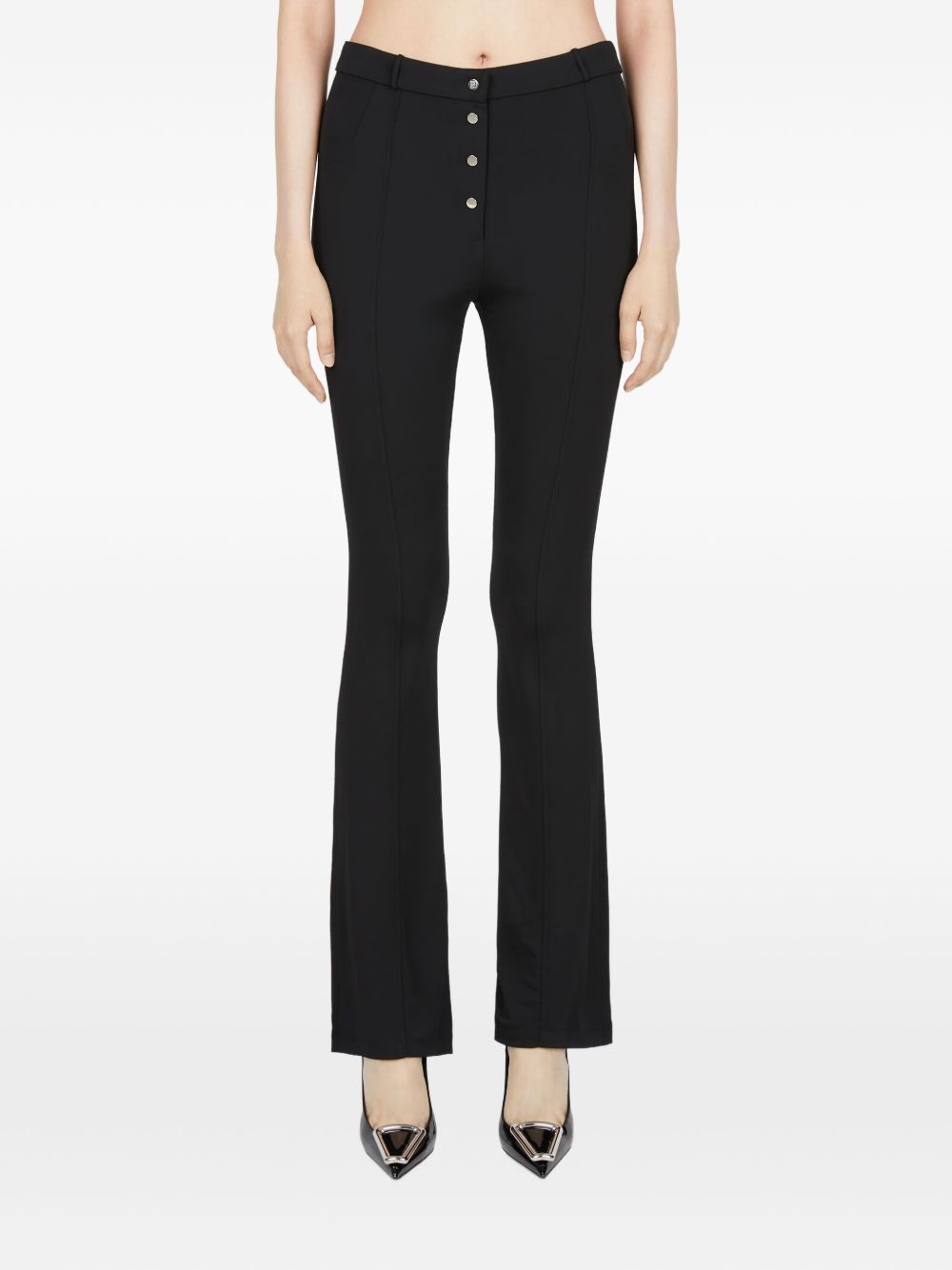 flared trousers Highlights - Black - Concealed fly and button fastening - Two rear patch pockets - Belt loops - Straight hem Imported Composition Viscose 95%, Elastane 5% Washing instructions Read Manufacturer Guidelines