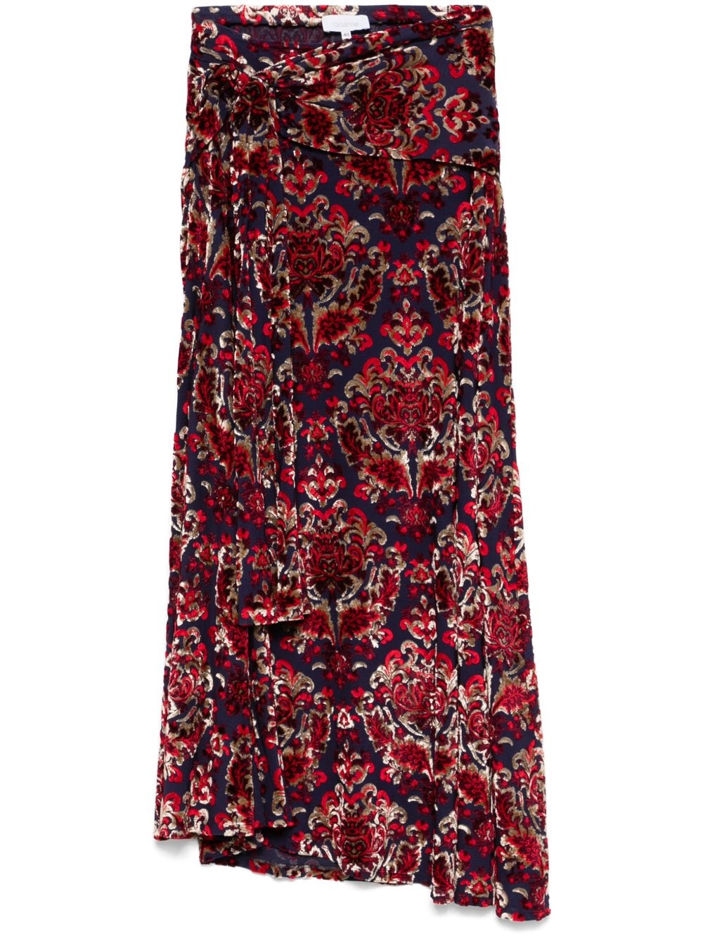 flocked-pattern maxi skirt Highlights - Navy blue - Side tie fastening - Elasticated waistband - Flared hem Imported Composition Viscose 95%, Elastane 5%
