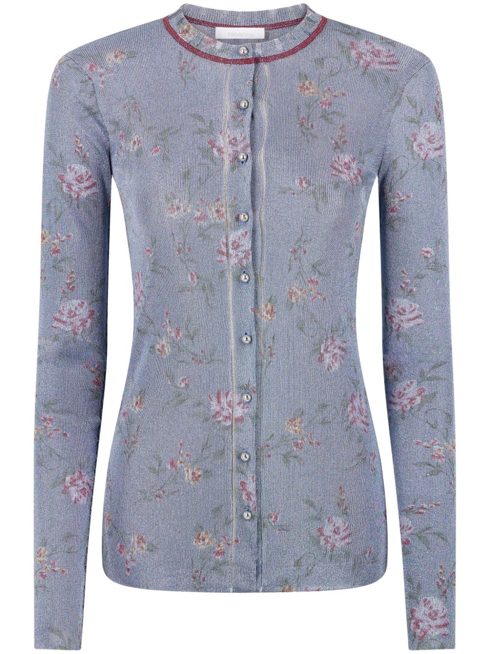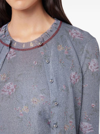 floral-print cardigan Highlights - Powder blue - Front button fastening - Crew neck - Long sleeves - Straight hem Imported Composition Viscose 49%, Metal 35%, Fabric 16%