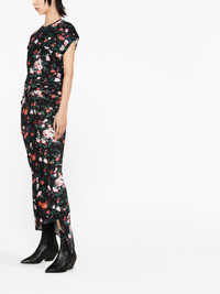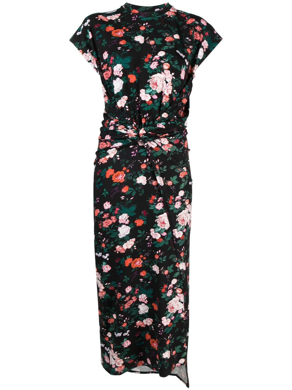 floral-print maxi dress black/multicolour all-over floral print round neck cap sleeves twist detailing belted waist asymmetric hem Imported Composition Viscose 95%, Spandex/Elastane 5% SIZE & FIT Model measurements Height 5 ft 11 in(1.8 m) Bust/Chest 31.49 in(80 cm) Hips 35.43 in(90 cm) Waist 25.19 in(64 cm)
