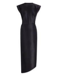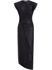 gathered-detail draped midi dress Highlights - Black - Stretch-design - Draped design - Layered design - Gathered detailing - Ring hardware detailing - Asymmetric design - Round neck - Cap sleeves - Fitted waistline - Mid-length - Asymmetric hem Imported Composition Viscose 90%, Elastane 10% SIZE & FIT Measurement LENGTH 52.36 in(133 cm) WAIST 29.13 in(74 cm) HIPS 34.64 in(88 cm)