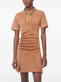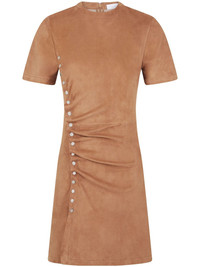 gathered mini dress Highlights - Caramel brown - Press-stud fastening - Crew neck - Short sleeves - Thigh-length Imported Composition Sheepskin 100% SIZE & FIT Measurement SLEEVE LENGTH 9.44 in(24 cm) HIPS 29.92 in(76 cm) LENGTH 33.07 in(84 cm) WAIST 24.4 in(62 cm)