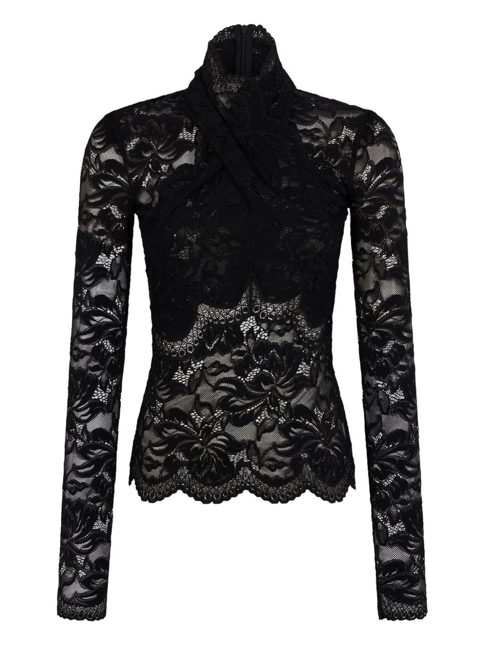 lace long-sleeve blouse Highlights - Black - Long sleeves - High neck - Scalloped hem Imported Composition Polyamide 90%, Elastane 10% Washing instructions Read Manufacturer Guidelines