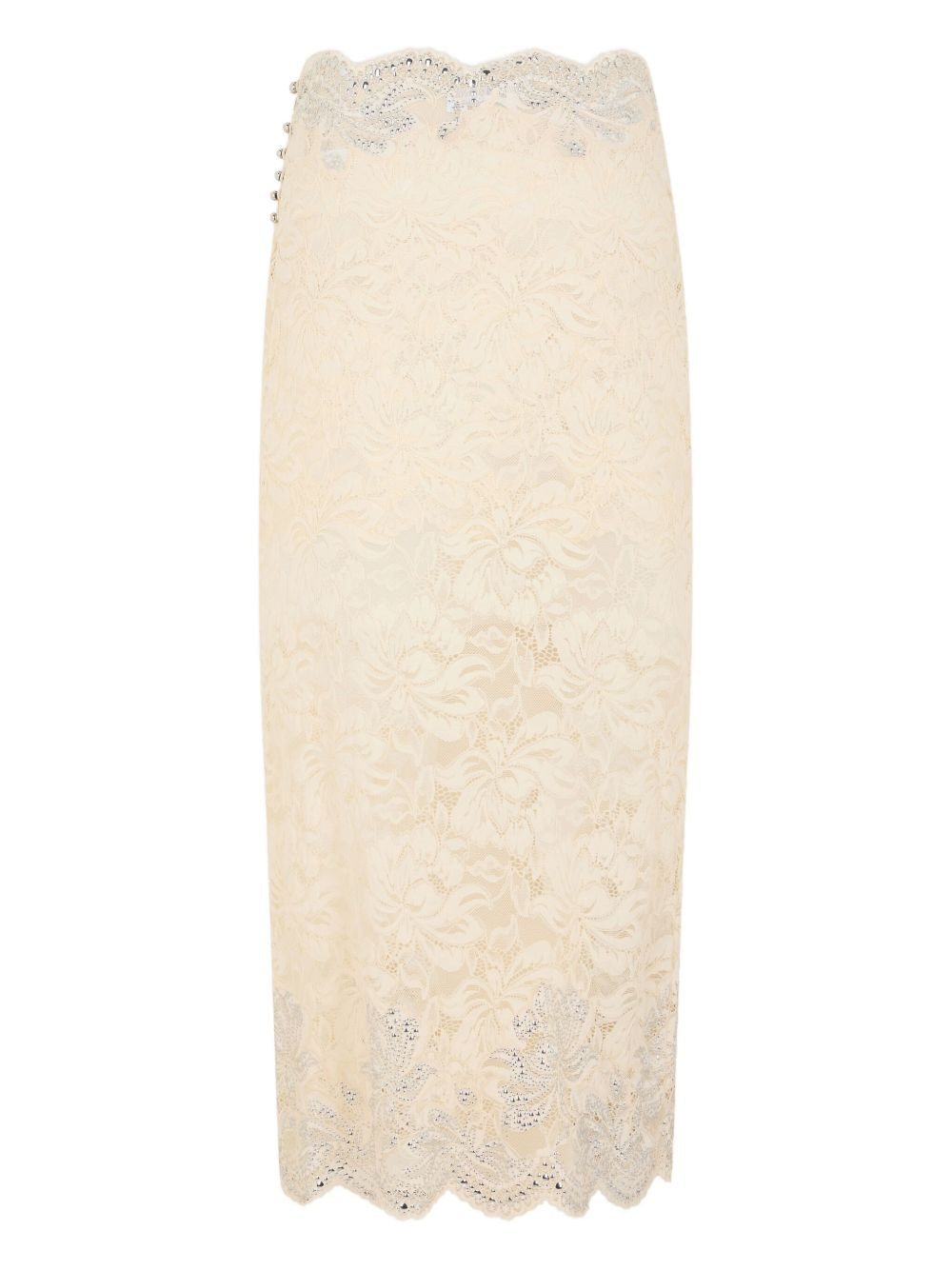 lace scalloped-hem midi skirt Highlights - Off-white - Lace fabric - Scalloped hem - Button detailing Imported Composition Polyamide 90%, Elastane 10% Washing instructions Read Manufacturer Guidelines