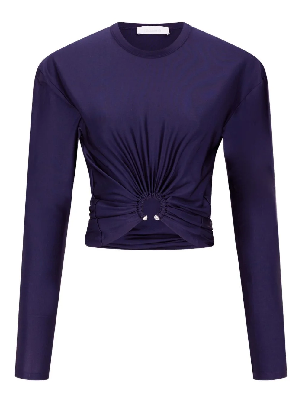 long-sleeve piercing-detail top Highlights - Dark blue - Satin finish - Piercing detail - Long sleeves - Crop style - Round neck Imported Composition Viscose 90%, Elastane 10% Washing instructions Read Manufacturer Guidelines