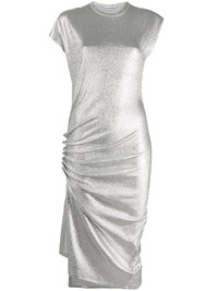 metallic ruched side dress Silver-tone metallic ruched side dress from Paco Rabanne featuring a textured style, a metallic sheen, a ruched side section, an asymmetric style, a mid-length, a round neck and short sleeves. Imported Composition Viscose 75%, Polyester 20%, Spandex/Elastane 5% SIZE & FIT Model measurements Height 5 ft 10 in(1.78 m) Bust/Chest 27.95 in(71 cm) Hips 35.82 in(91 cm) Waist 24.01 in(61 cm) Measurement HIPS 30 in(76.2 cm) LENGTH 45 in(114.3 cm) WAIST 25.98 in(66 cm) BUST 30 in(76.2 cm) FittingInformation This piece fits true to size. We recommend you get your regular size Cut for a slim fit Made with a mid-weight stretch fabric Washing instructions Dry Clean Only