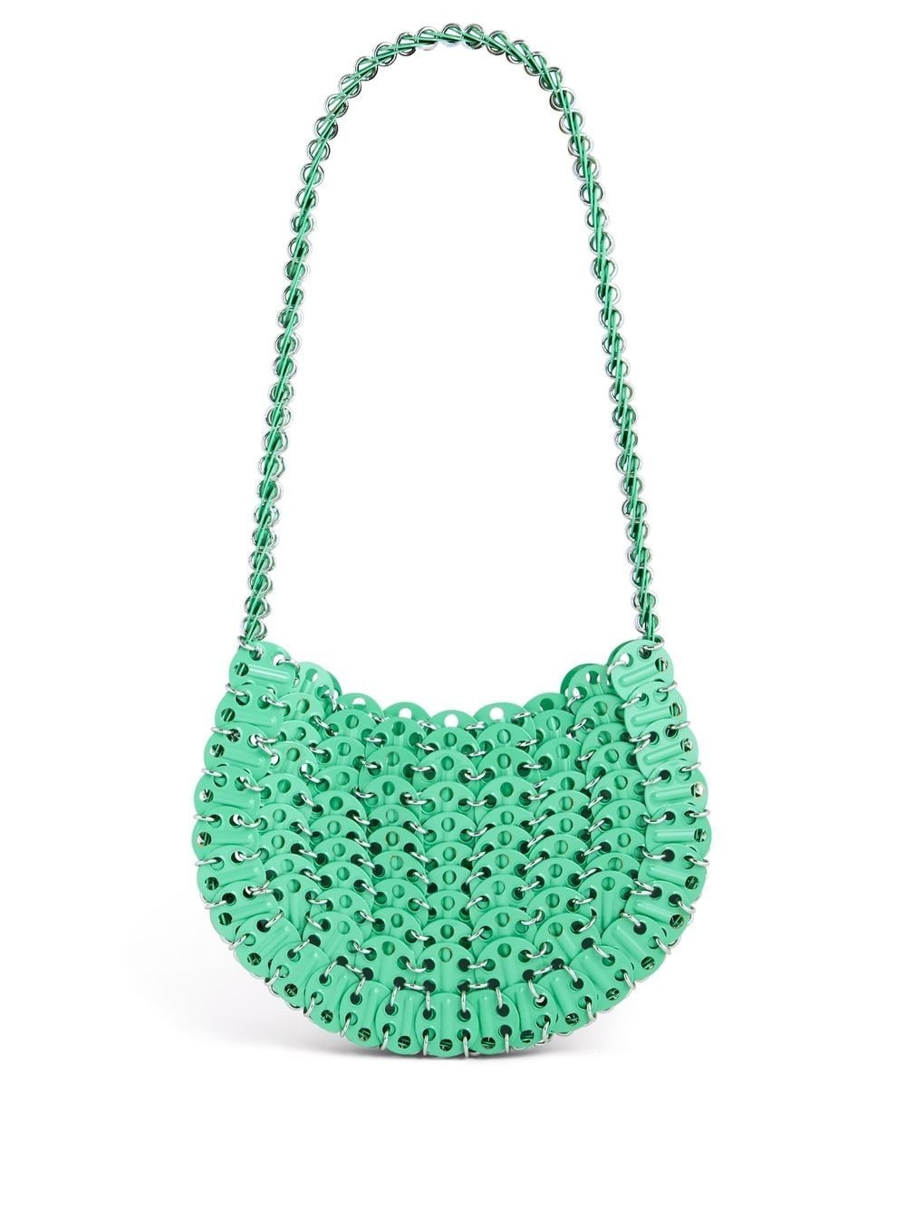 Moon 1969 shoulder bag Paco Rabanne is known for its use of unusual materials. This tote bag is comprised of emerald green metal discs, channelling the brand’s experimental approach. Imported Composition Outer: Brass 100% SIZE & FIT Measurement DEPTH 1.18 in(3 cm) HANDLE 8.26 in(21 cm) WIDTH 8.66 in(22 cm) HEIGHT 5.51 in(14 cm)