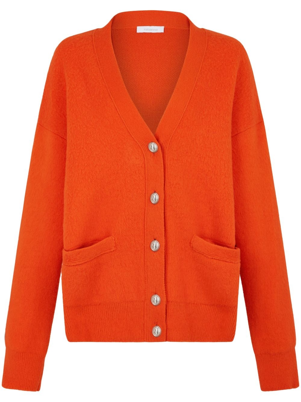 oversized wool cardigan Highlights - Carrot orange - Wool - Front button fastening - V-neck - Two front patch pockets - Drop shoulder - Oversized long sleeves - Ribbed cuffs and hem Made in Italy Composition Wool 100% SIZE & FIT FittingInformation Designed to be unstructured, offering a loose fit throughout Made with a midweight knit, this piece offers some stretch