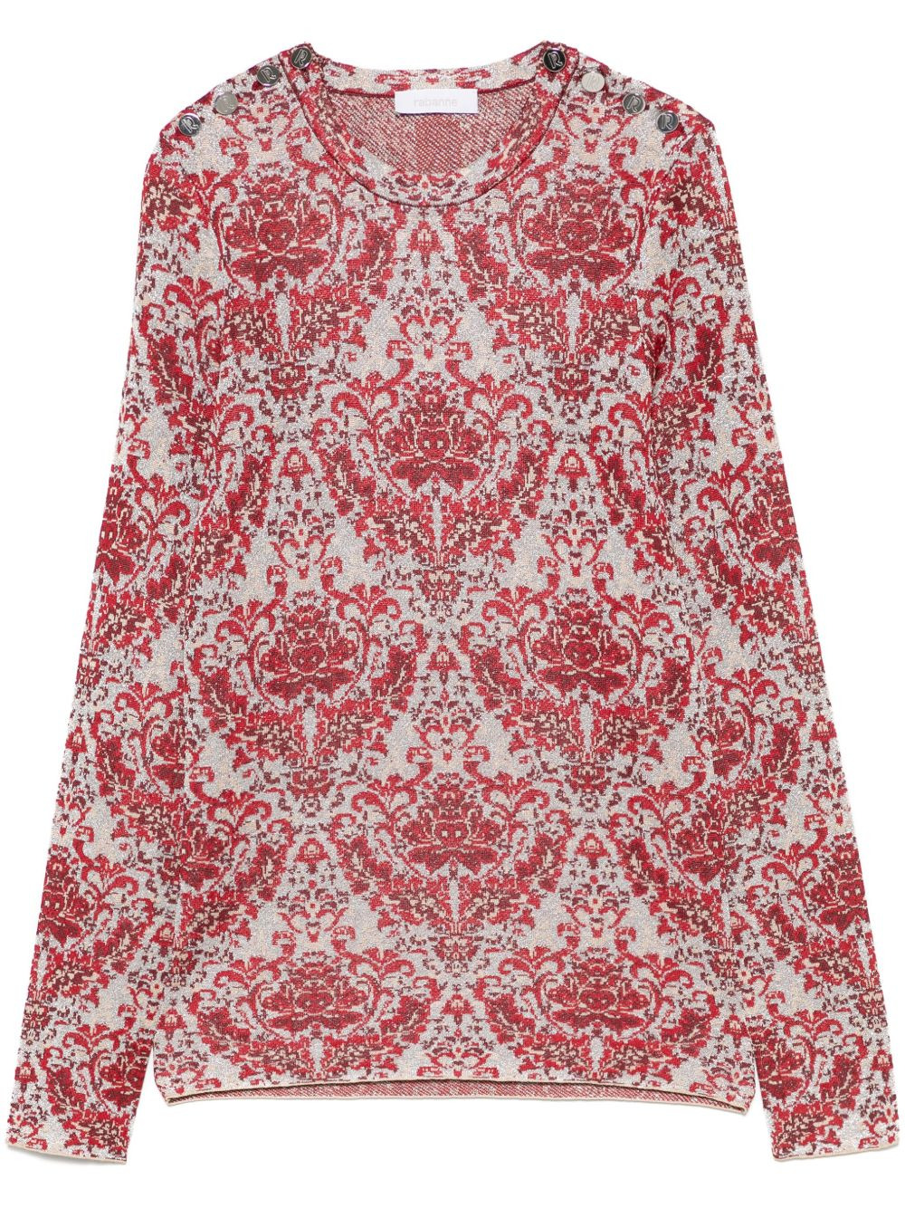 paisley-jacquard top Highlights - Silver-tone - Press-stud fastening at the shoulder - Crew neck - Long sleeves Imported Composition Viscose 80%, Metallized Polyester 20% SIZE & FIT Model measurements Height 5 ft 9 in(1.75 m) Bust/Chest 31.88 in(81 cm) Hips 34.64 in(88 cm) Waist 24.01 in(61 cm) FittingInformation Designed for a slim fit that sits just away from the body offering a close yet comfortable fit Made from a midweight non-stretch fabric, this piece offers minimal elasticity when worn Washing instructions Dry Clean Only