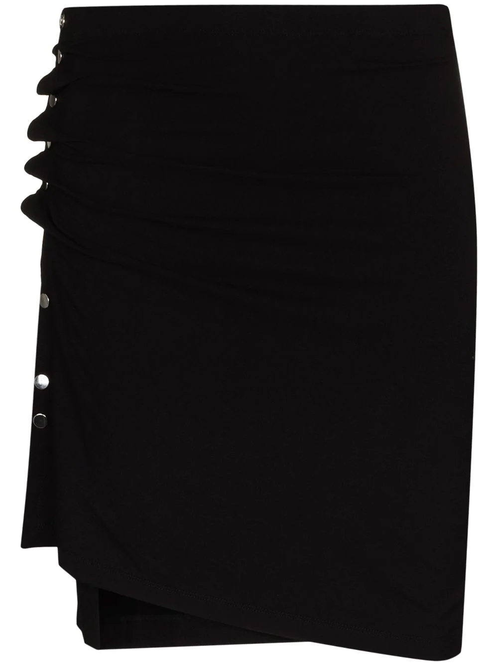 ruched-detail asymmetric miniskirt Paco Rabanne transforms the classic black miniskirt with its edgy elegance. Crafted from a stretchy fabric, this piece is defined by its ruched, asymmetric silhouette, accentuated by the press studs. Imported Composition Viscose 92%, Spandex/Elastane 8% SIZE & FIT Model measurements Height 5 ft 10 in(1.78 m) Bust/Chest 30.7 in(78 cm) Hips 33.85 in(86 cm) Waist 22.44 in(57 cm) FittingInformation This piece fits true to size. We recommend you get your regular size Cut for a slim fit Made with a mid-weight stretch fabric Washing instructions Machine Wash