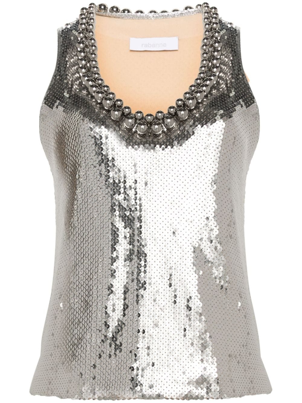 sequin-embellished top Paco Rabanne's penchant for glimmering designs is encapsulated in the shimmering silver-tone sequin construction. The metallic effect is enhanced by two rows of large beads at the neckline. Highlights - Silver-tone - All-over sequin embellishment - Bead embellishment - Metallic threading - Scoop neck - Sleeveless - Full lining - Straight hem Imported Composition Outer: Cupro 60%, Polyester 30%, Polyamide 10% Lining: Polyamide 90%, Elastane 10% SIZE & FIT Model measurements Height 5 ft 11 in(1.8 m) Bust/Chest 33.07 in(84 cm) Hips 37 in(94 cm) Waist 25.59 in(65 cm) FittingInformation Designed for a slim fit that sits just away from the body offering a close yet comfortable fit Made from a midweight stretch fabric, this piece offers elasticity and flexibility when worn This piece fits true to size – take your usual size Washing instructions Dry Clean Only