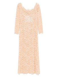 sequinned lace maxi dress Highlights - Light beige - Lace overlay - All-over sequin embellishment - Ruched detailing to the front - Off-shoulder - Long sleeves - Scallop edge - Partial lining - Flared - Straight hem - Long length Imported Composition Polyamide 90%, Elastane 10% SIZE & FIT Model measurements Height 5 ft 11 in(1.8 m) Bust/Chest 32.67 in(83 cm) Hips 36.22 in(92 cm) Waist 24.4 in(62 cm)