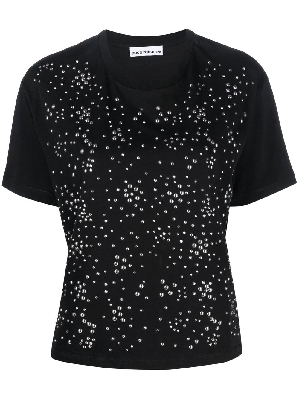 studded short-sleeved T-shirt This black top by Paco Rabanne channels the brand's space-age aesthetic by adorning the front with silver-tone stud detailing. A crew neck and short sleeves frame this casual piece. Highlights - Black - Organic cotton - Silver-tone stud embellishment - Round neck - Drop shoulder - Short sleeves - Straight hem Imported Composition Organic Cotton 100% SIZE & FIT Model measurements Height 5 ft 10 in(1.78 m) Bust/Chest 33.46 in(85 cm) Hips 36.22 in(92 cm) Waist 23.22 in(59 cm) FittingInformation This piece fits true to size. We recommend you get your regular size Cut for a loose fit Made with a mid-weight fabric Washing instructions Machine Wash