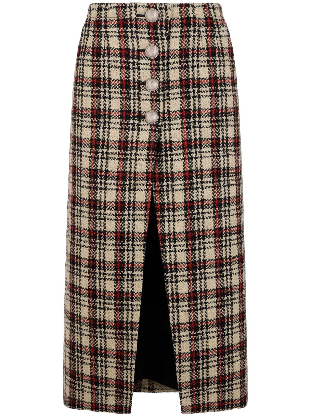 tartan-pattern midi skirt Highlights - Cream white/black/burnt orange - Wool-cotton blend - Tartan check pattern - Front button fastening - Logo-embossed buttons - Two side slash pockets - Front slit - Straight hem - Mid-length Imported Composition Wool 80%, Cotton 20% Washing instructions Read Manufacturer Guidelines