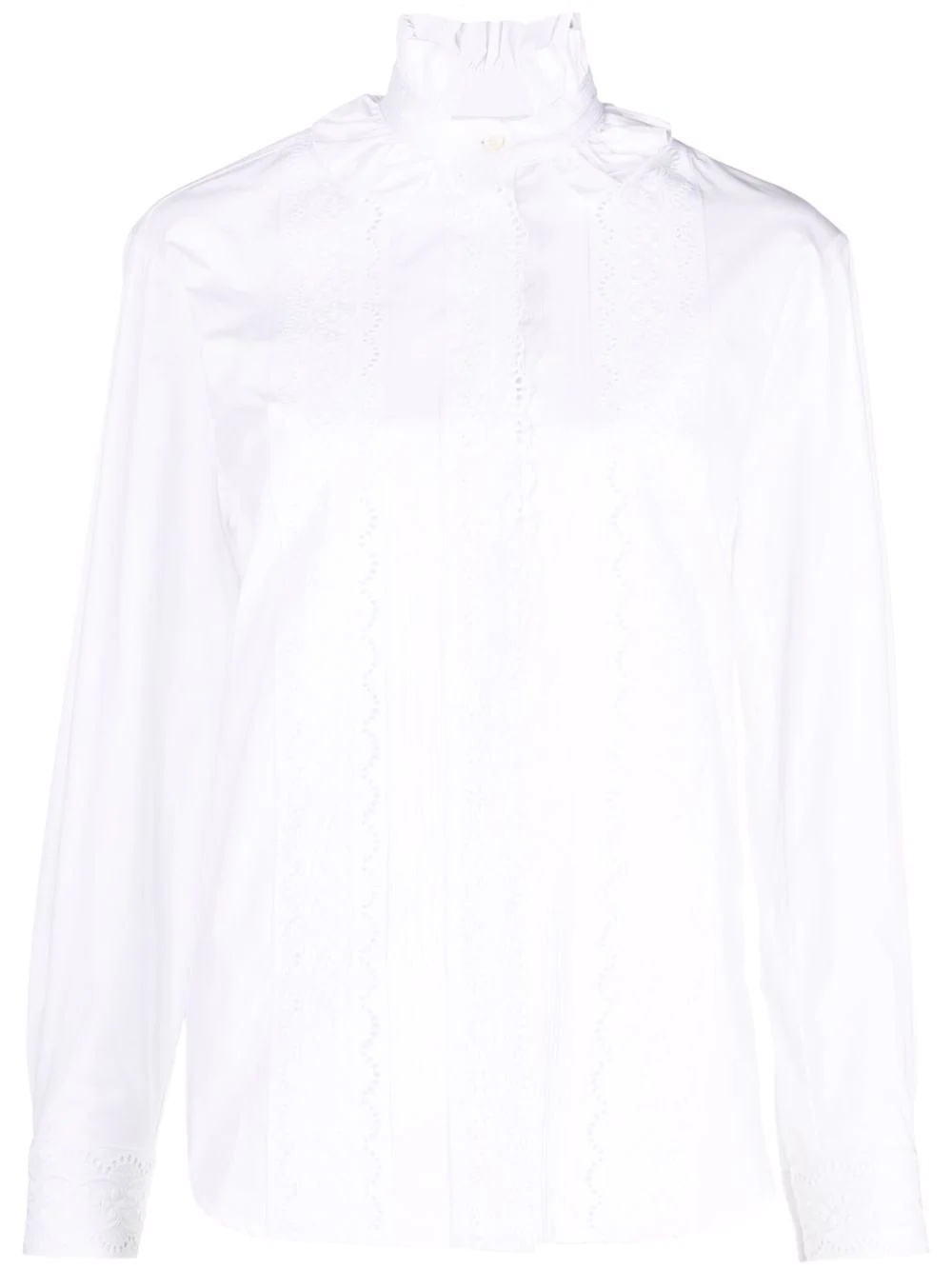 ruffled shirt Highlights - White - Cotton - Ruffle collar - Front button fastening - Buttoned-cuff sleeves - Long sleeves Imported Composition Cotton 100% SIZE & FIT Model measurements Height 5 ft 11 in(1.8 m) Bust/Chest 31.1 in(79 cm) Hips 34.25 in(87 cm) Waist 22.83 in(58 cm) FittingInformation This piece fits true to size. We recommend you get your regular size Cut for a loose fit Made with a mid-weight non-stretch fabric Washing instructions Machine Wash