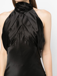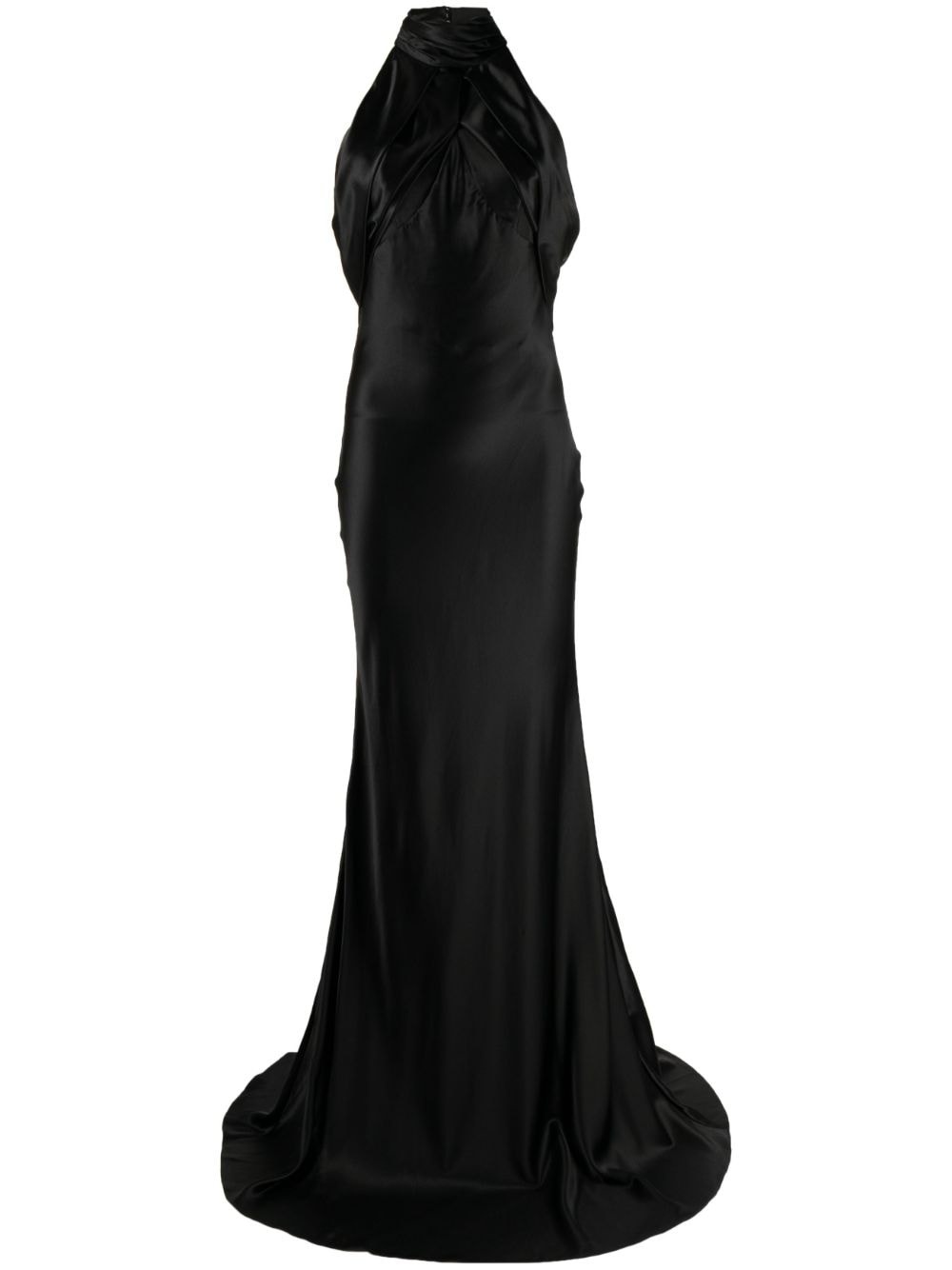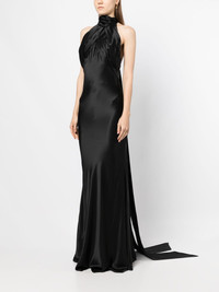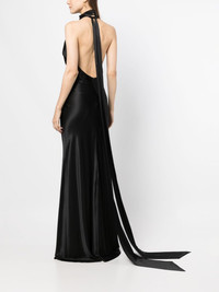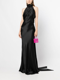 Audrey halterneck silk gown Reflecting the brand's sophisticated style, the Audrey dress by Rachel Gilbert is defined by a gently draped halterneck that leaves a long strap cascade to the back. Made from silk satin, the piece is completed with a curved back opening that adds elegance to the look. Highlights - Black - Silk - Satin finish - Draped detailing - Halterneck - Rear tie fastening - Open back - Concealed rear zip fastening - Floor-length Imported Composition Outer: Silk 100% SIZE & FIT Model measurements Height 5 ft 11 in(1.8 m) Bust/Chest 28.34 in(72 cm) Hips 35.43 in(90 cm) Waist 23.62 in(60 cm) FittingInformation Particularly long in length; consider your own measurements
